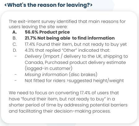 Exit intent surveys informed us that a main reason customers were leaving was because the product page was missing important conversion information about the shipping, warranty and financing. This was the reason for 22% of exits.