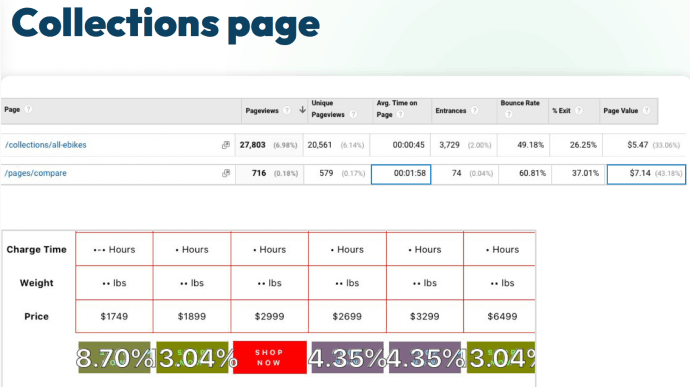 From surveys and analytics we noticed that many visitors were confused on which bike to select. FLX had a compare page but most visitors were not seeing it. When we looked into analytics we found that the page value of anyone who did end up seeing the page was significantly higher than those that did not.